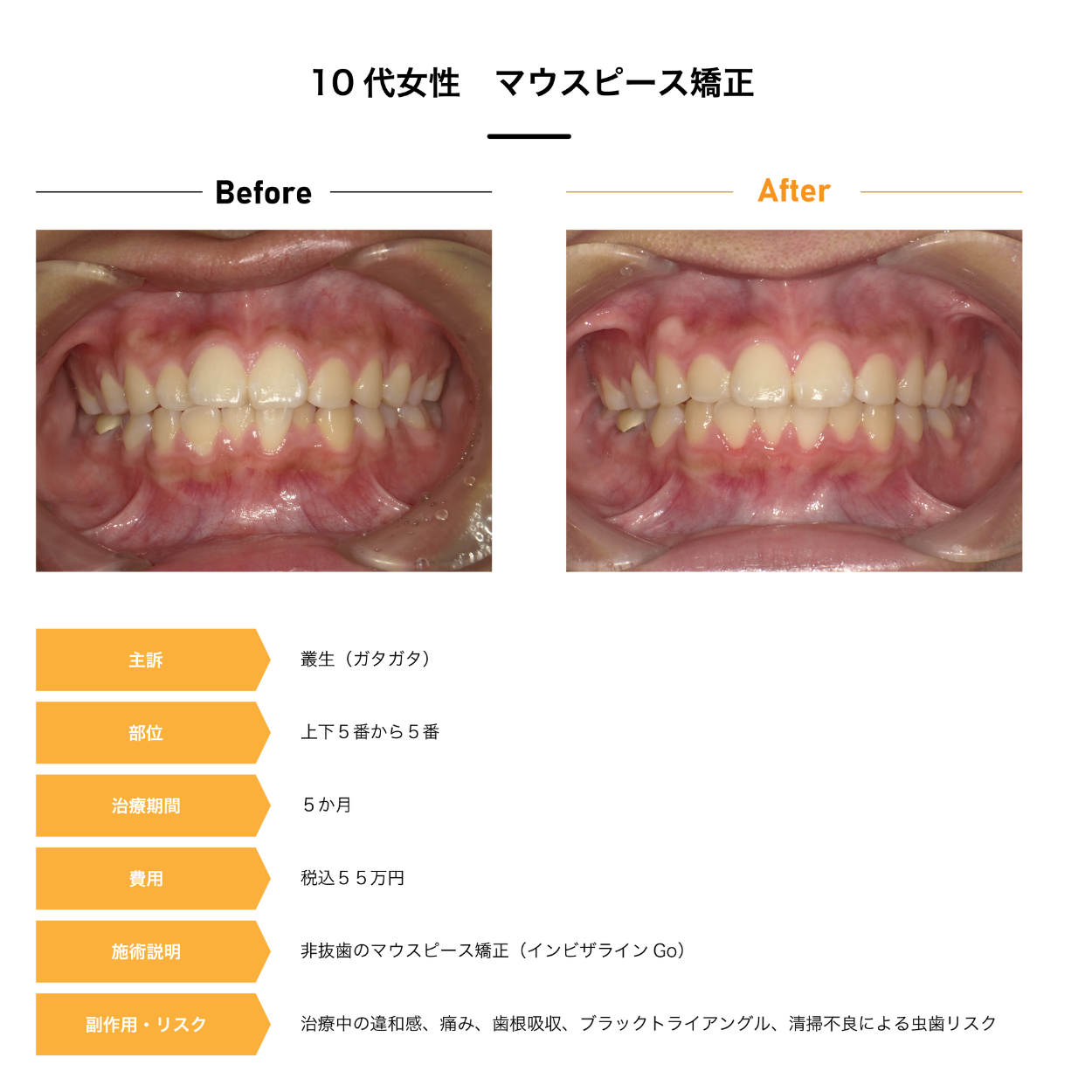 一方で、気になる前歯だけをインビザラインGoを使って矯正する場合は対応できる症例に限りはありますが、